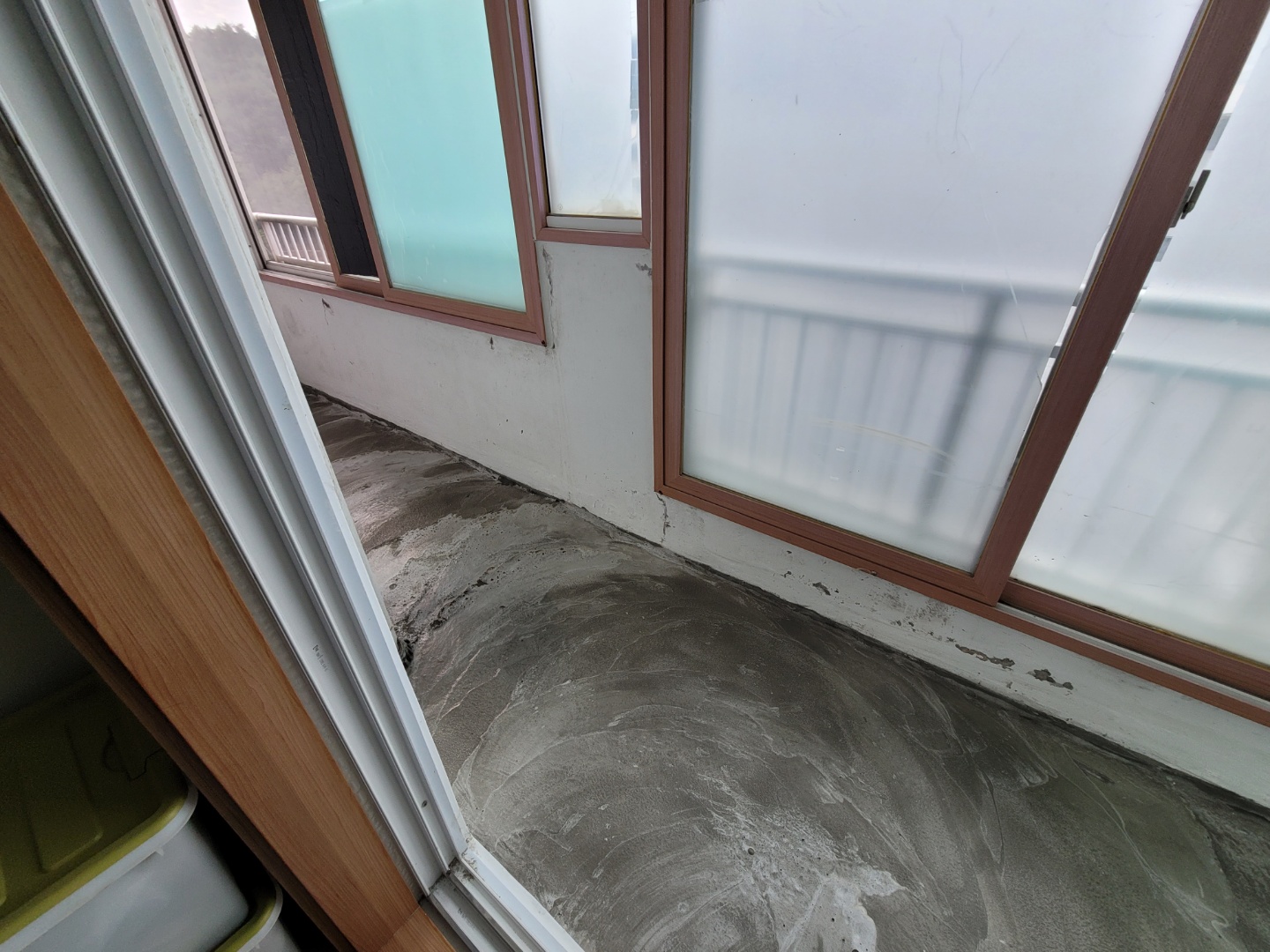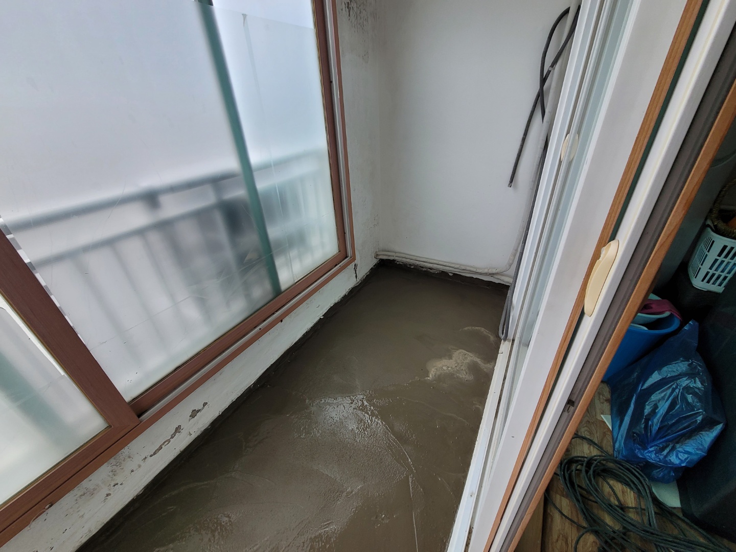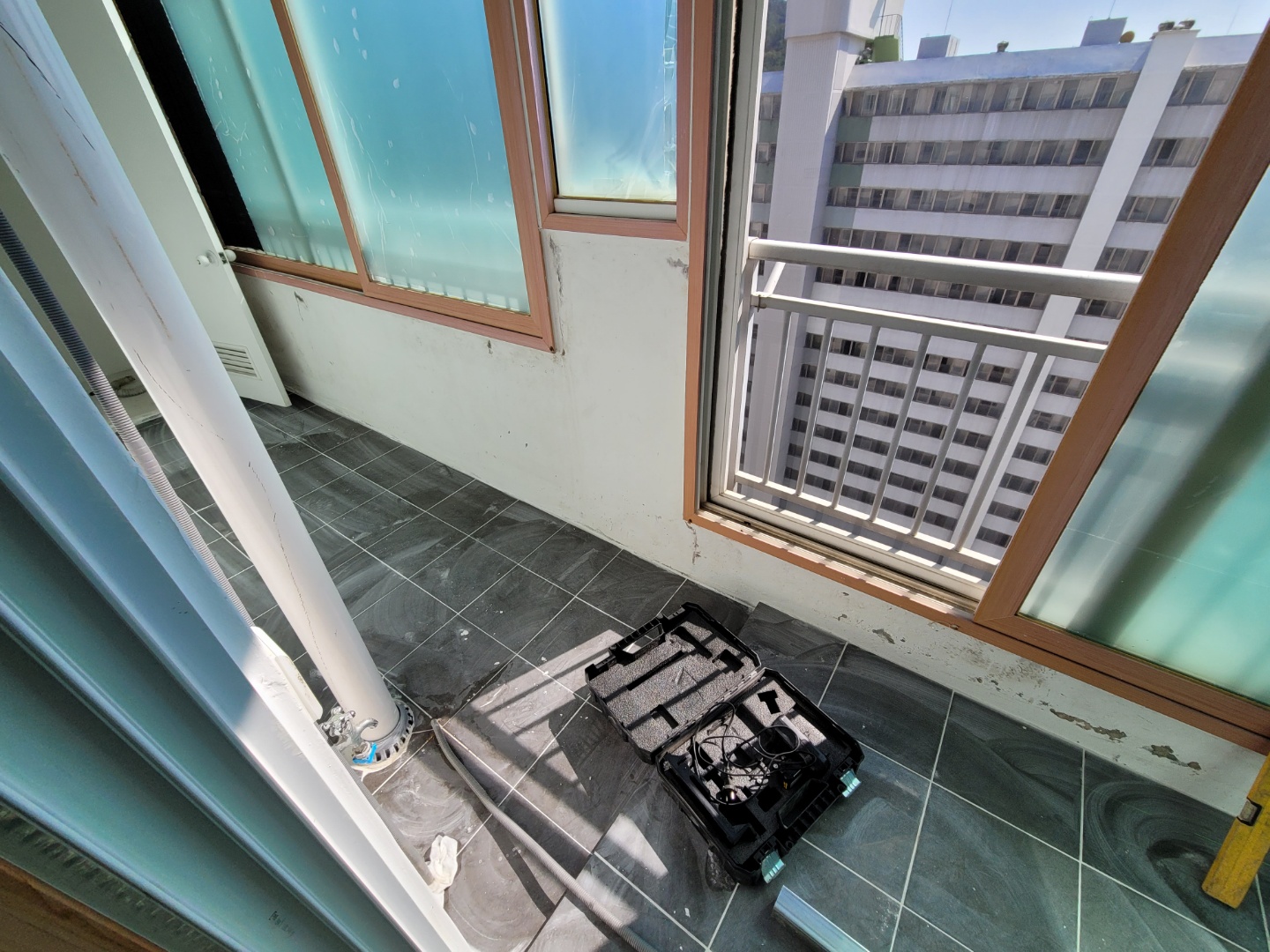 앞베란다의 바닥타일이 철거된 모습입니다. 기계로 부셔서 철거는 해야되네요..