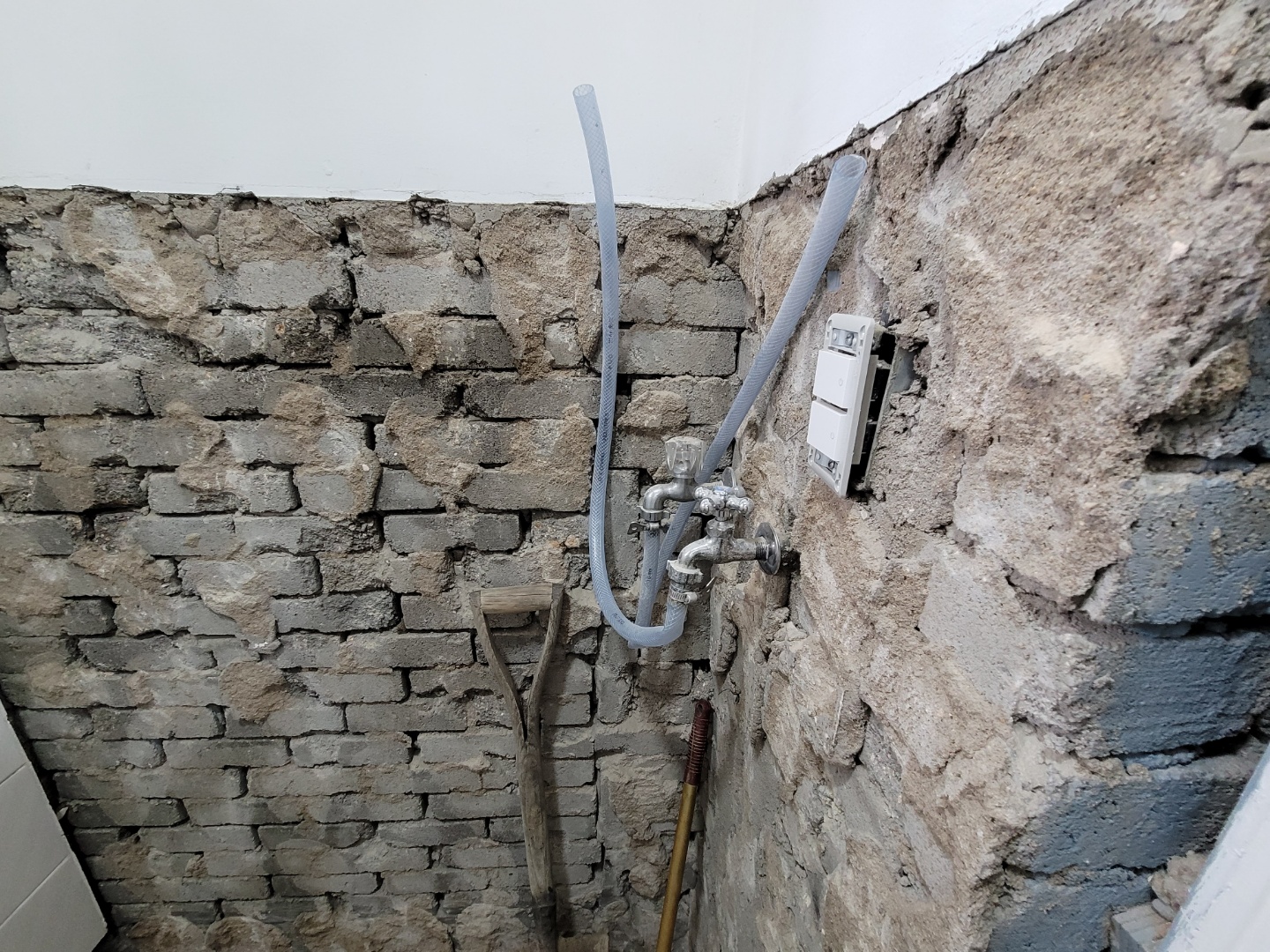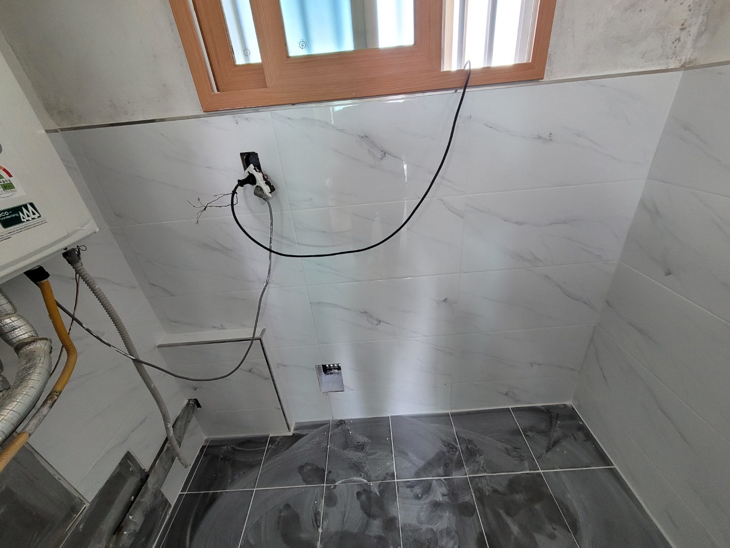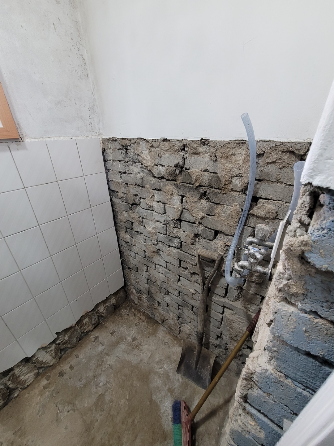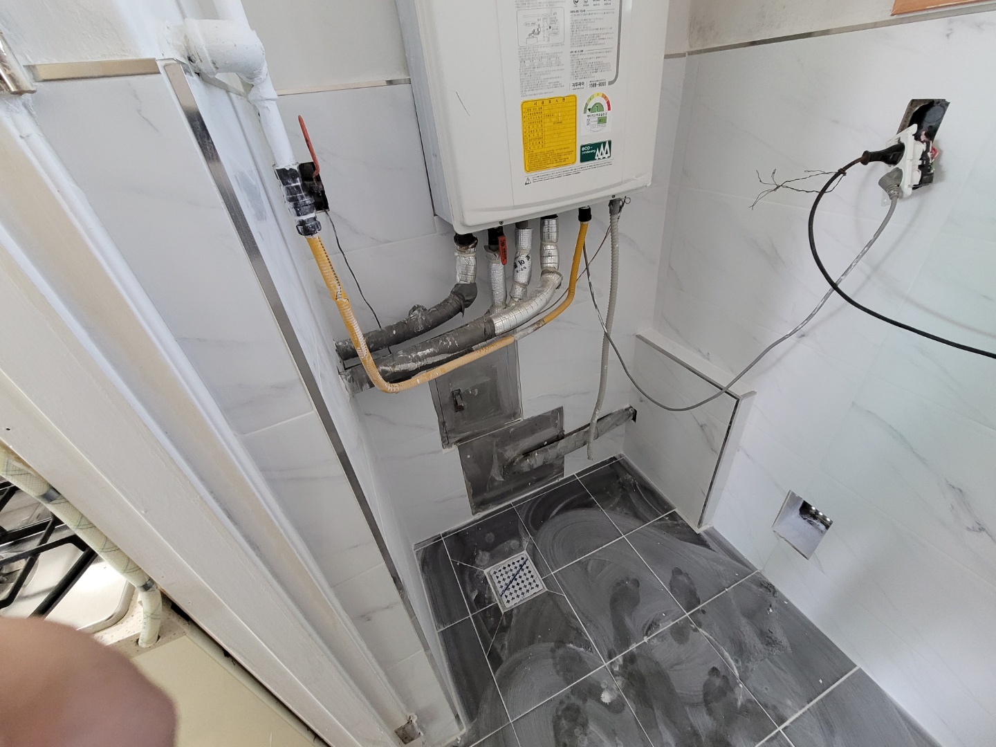 보일러실의 바닥과 벽면 일부타일이 철거된 모습입니다. 이제 여기다가 방수 작업을 해야겠이요..