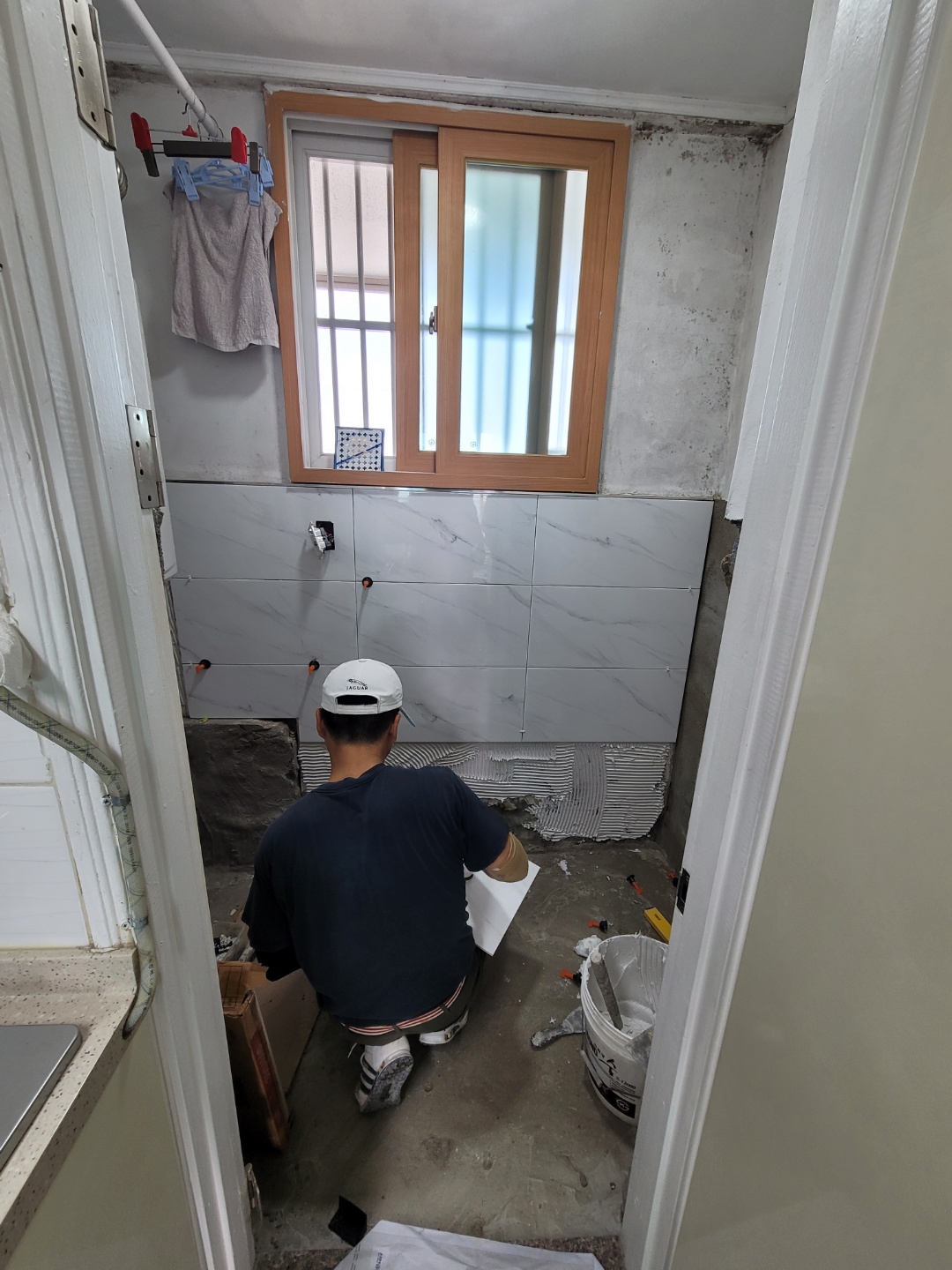 타일공사중인 모습입니다. 타일 공사할때 현관바닥타일도 동일한 바닥타일로 공사하면 10만원 추가만 하면 된다고 했는데 당일날 보니깐 신발장위에 타일이 있던데 신발장이 고정이라서 이동이 안되더라구요.. 그래서 현관바닥타일 진행을 못해서 아쉽네요.